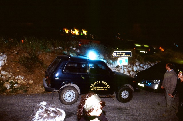 Das ist jetzt vorbei, denn, als ob die Szene nicht schon skuril genug wäre, versucht jeder Gläubige das Leiden Christi mittels der, in der ausgestreckten Hand von sich gehaltenen Handycamera aufzunehmen. Das klappt hier ausgezeichnet, doch schon an der nächsten Station wird´s schwieriger. Das flackernde Blaulicht zeugt von der Ordnungsmacht, die hier versucht, profane Handlungen hintanzuhalten. Aus dem, sonst als Parkplatz dienenden Stück Brachland, wurde für heute Golgotha. Drei Kreuze, dem Wind ausgesetzt, drei trauernde Frauen knien davor, wir werden auf Distanz gehalten. Der Wind trägt Wortfetzen herüber. Ja, Jesus spricht! Er beklagt das Wetter, die eisige Nacht, und dass er nun schon seit zwei Stunden in diesem knappen Lendenschurz hier oben stehe, auch, daß ihm ab und an rakomelo, heisser, mit honig verfeinerter raki gereicht wird lässt die Kälte nicht ewig ertragen. Seine Mitgekreuzigten stimmen ihm zu, die Gruppendynamik sorgt dann für ein Gespräch, das, alte Frauen sich hektisch bekreuzigen lässt. Schliesslich beschliessen die Gekreutzigten, unter den gegebenen Wetterbedingungen Golgotha besser zu verlassen, verabreden sich in einer Bar, steigen vom Kreuz und in ihre Autos.