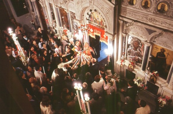 Nun, kurz vor Mitternacht, hat die Spannung in der Kirche ihren Höhepunkt erreicht. Hinter der Türe inmitten des Hauptaltares bereitet sich der Pope vor, die Auferstehung zu verkünden, aber man spürt geradezu, wie die Gläubigen dahinter den Auferstandenen selbst wähnen, so drängen sie nach vorn. Plötzlich erlischt das Licht, die Glocken beginnen hektisch zu schlagen, und die Tür öffnet sich. Der Pope tritt heraus, in prächtigem Festtagsornat, und hält es in Händen- Das Licht. Die Gläubigen strecken sich, stehen auf Zehenspitzen, mit ausgestreckten Armen versucht jeder als erster, seine Kerze an der des Popen zu entzünden. Doch dieser lächelt verschmitzt, hält die Kerze hoch, fast schon hat der Erste sie erreicht, er lächelt ein bisserl mehr, und hält seine Kerze ein bisserl höher, die Gläubigen werden ein bisserl grantig, der Pope muss schon lachen. Und endlich lässt er seine Herde gewären, die Ersten drängen nach draussen, um die Flamme weiterzugeben.