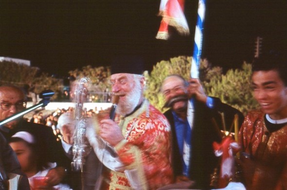 Nun schreitet auch der Pope nach draussen, ein Messner mit einem Buschen auf einem langen Stab geht ihm voran. Auf den Stufen vor der Kirche betritt der Pope ein für diesen Anlass errichtetes Podium, um, mit dem Rücken zu den Gläubigen, ihnen die frohe Botschaft kundzutun. Weil er seine Brille vergessen hat, pflückt er kurzentschlossen einem der umstehenden Honoratioren seine, an einem Ketterl baumelnde Lesebrille vom Hals. Der Messner wirft die Stange hoch, fängt sie wieder, sein verklärter Gesichtsausdruck gibt Zeugnis von seiner grossen Freude. Was den unvorbereiteten Reisenden, die umstehenden Kinder und alten Damen in Schrecken versetzt, ist das unvermittelt einsetzende Geknalle. Da die griechische Kirche, wie auch die römische, den Ostersonntag als Beginn des Jahres feiert, und die Bevölkerung hierin mit der Amtskirche einer Meinung ist, findet das haidnische Geknalle hier direkt im Anschluss an das höchste Kirchenfest statt. Auch Feuerwerk wird geschossen, auf Tinos gibt es seit Jahren erbitterten Schusswechsel zwischen zwei Kirchen, regelmässig kommt es zu Bränden, und das Fernsehen berichtet live von dort.