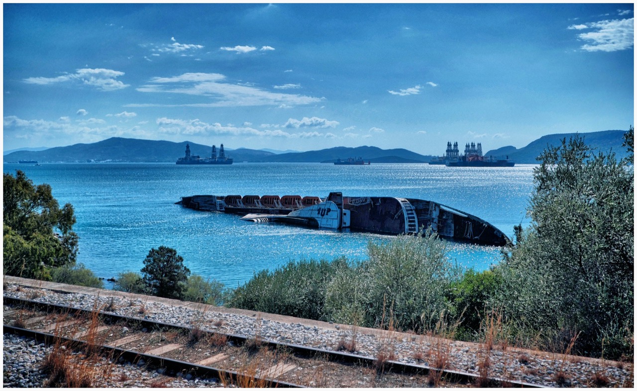 Ganz anders verhielt es sich mit der „European Sky“. Die trat 1953 in Newcastle ihren Dienst als Linienschiff an, verkehrte bis 1971 planmaessig von London nach Mosambik. Danach wurde sie zur luxurioesen Autofaehre geadelt, im Auftrag der Karageorgis Line transportierte sie bis 1996 Passagiere komfortabel von Ancona ueber Patras bis nach Rhodos, Klimaanlage und Bad in jeder Kabine waren damals noch nicht selbstverstaendlich. Nachdem die Karageorgis zahlunsunfaehig wurden lag die Mediterranean Sky arretiert am Pier in Elefsina, als sie im Herbst 2002 zu lecken begann. Ich konnte mitansehen, wie sie, um nicht im Hafen zu sinken schnell noch hinausgeschleppt wurde, keine drei Wochen spaeter hat sie sich’s gemuetlich gemacht. Seither liegt sie friedlich im Seichten, man wird sie wohl auch noch im Kulturhauptstadtjahr besuchen koennen.