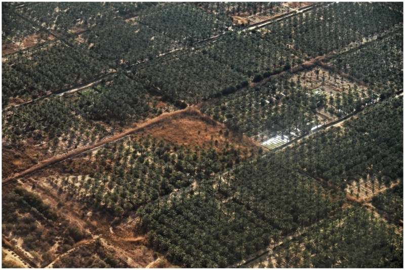 Anflug im ersten Sonnenlicht, unten karge Landschaft, Wüste, Sinkflug, Kurve, jetzt erkennt man die Plantagen, zwischen den akribisch rechtwinkelig angepflanzten Palmenreihen funkeln riesige Lacken, wer hat der hat, wir landen…